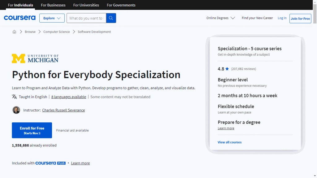 - Python for Everybody by University of Michigan